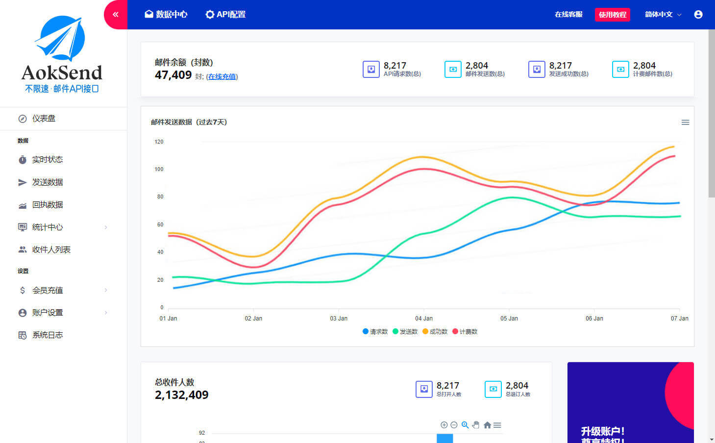 AokSend郵件推送服務的郵件接口API產品理念:細分垂直、簡單強大、專注穩定。(即在細分行業做垂直產品;力求產品簡單好用的同時提供強大的功能;專注觸發式郵件的IP池,長期穩定的郵件發送效果。)選擇AokSend郵件發送API推送接口的理由關鍵詞:15元每萬封、專用IP池、IP輪播、數據統計分析、全球內容加速、全球智能加速、7天刪除記錄、自動變量、預設郵件模板、數據追蹤等。